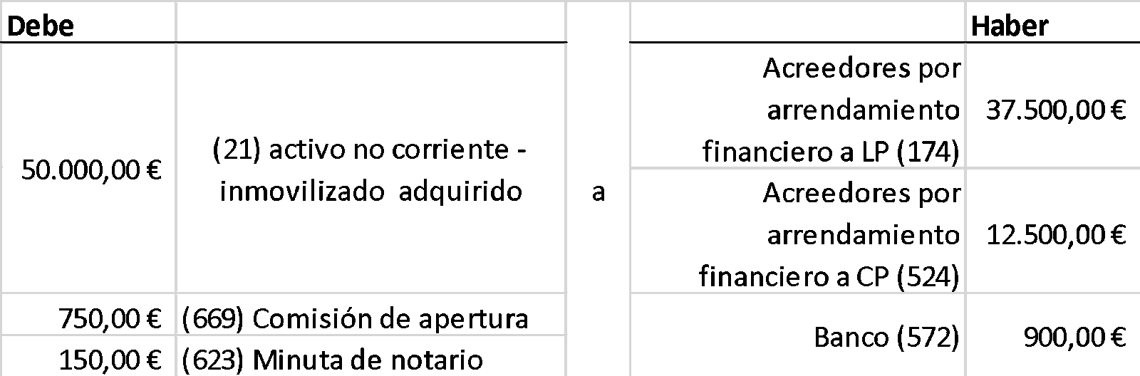 Vamos a explicar como se contabiliza con un ejemplo concreto. En él se contrata el leasing con cuotas constantes, anuales y prepagables; el valor del equipo es de 50.000€, la duración del contrato de cuatro años a un tipo de interés del 5% anual, con una comisión de apertura del 1,5% y pagando unos honorarios al notario del 0,3%.
