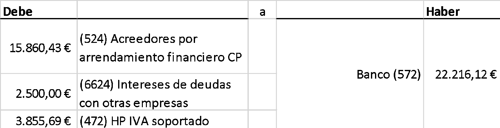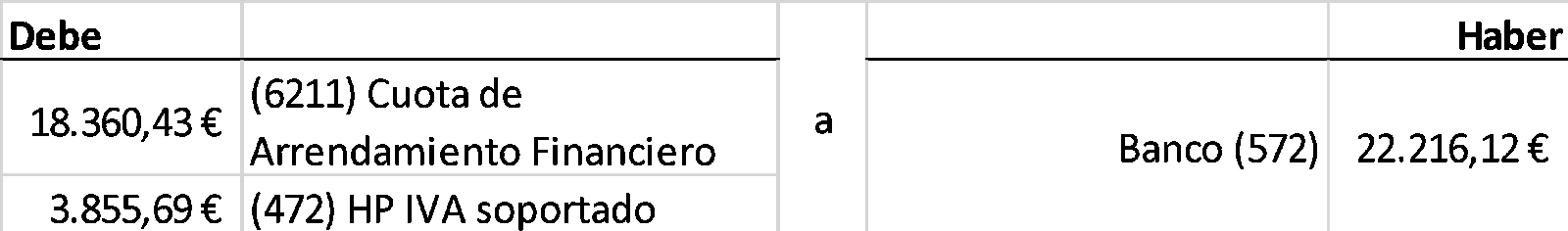 Para una microempresa toda la cuota del arrendamiento es un gasto (al que se debe sumar el IVA ) por lo que no necesita distinguir entre la cuota propiamente dicha y sus intereses. Por ello el asiento es muy sencillo y se hace de la siguiente manera: