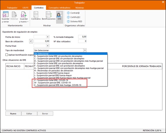 Estos nuevos tipos de inactividad los puedes localizar en la solapa Contratos dentro del apartado ERE de la ficha del trabajador.