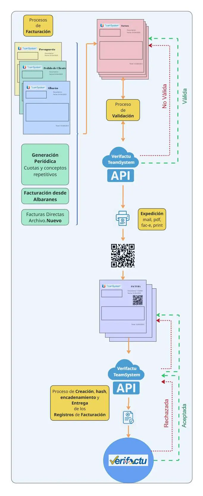 Los registros de facturación son enviados a un componente auxiliar denominado Verifactu TeamSystem API, el cual realiza las siguientes funciones:
